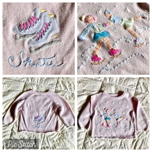 Vtg Embroidered Sweater 3D Girls Ice Skating Pink 2T Cotton Ramie Winter Snow