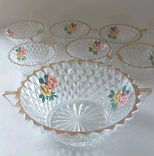 Dessert Bowl Set Fruit Punch Diamond Cut Glass Floral Handles Lubiana Italy
