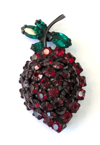 VTG Joseph Warner Red Glass Rhinestone Fruit Berry Japanned Brooch Pin 2"
