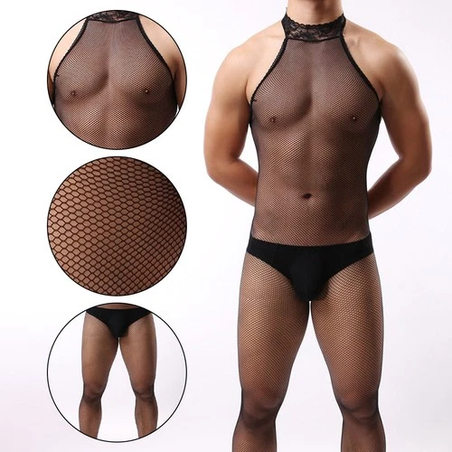 Fashion Men Leotard Bodysuit Full Lingerie Net Open Crotch See Through