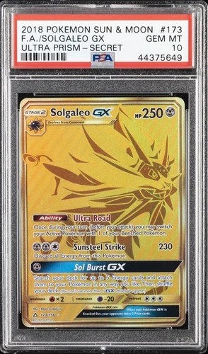 2018 POKEMON SUN & MOON ULTRA PRISM SECRET #173 FULL ART/SOLGALEO GX PSA 10