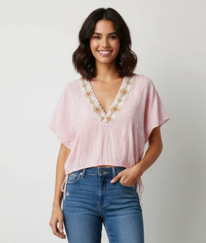 Free People Like A Breeze Cropped Top Womens XS Pink Gauze Cotton Flutter Sleeve
