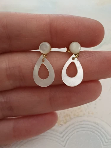 Vintage Earrings Gold Tone & Mother Of Pearl Teardrop Dangly Dangle 2cm Drop