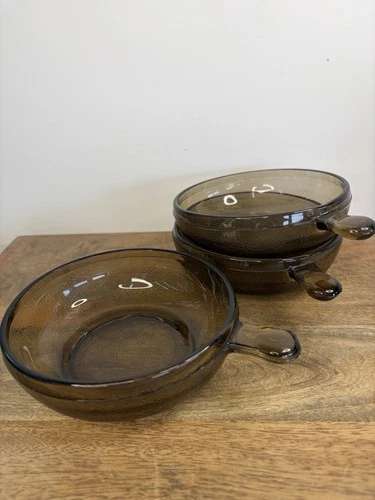 3 Vintage Glasbake Soup Chili French Onion Bowls with Handle Mint