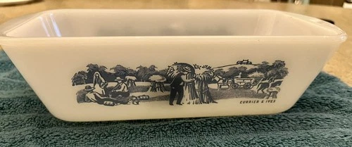 GLASBAKE Vintage Currier & Ives Blue & White Farm Scene 10" Loaf Pan J-522 - USA