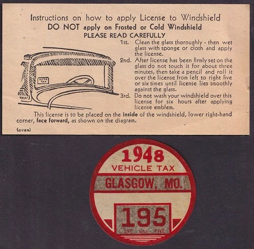 1948 Glasgow Missouri Vehicle Tax decal & instruction sheet in glassine sleeve