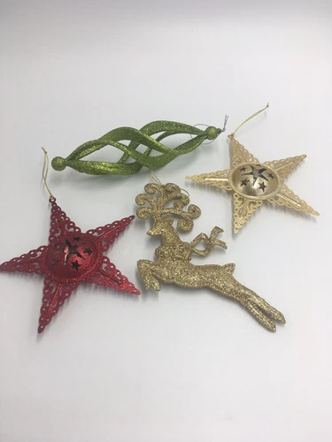 Lot of 4 Vintage Christmas Tree Ornaments Glitter Reindeer Stars with Bell Swirl