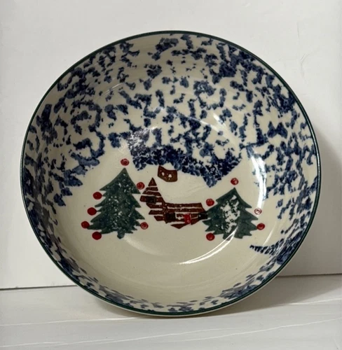 Folkcraft by Tienshan Cabin in the Snow Spongeware Cereal Bowl Christmas Red Dot