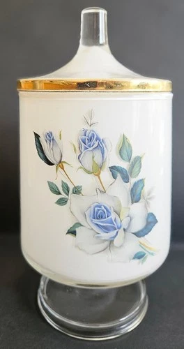 VTG West Virginia Glass Blue Rose, White Frosted Apothecary Vanity Jar Gold Trim