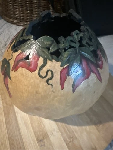 VTG Signed Dated Decorated Gourd Carved Open Work Painted Chili Peppers