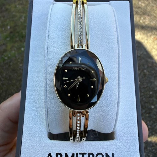 Armitron Women's 75/5903GP Black Dial Gold Tone Crystal Bangle Watch New Batter