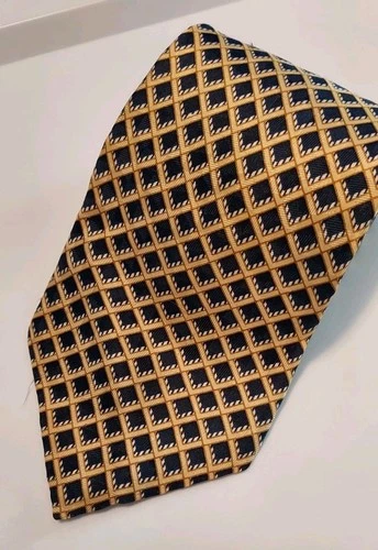 Etienne Aigner Silk Tie Navy Gold Geometric Diamond Grid Wide 58.5" x 4"