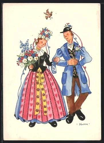 Artist postcard Rooster: a couple in costume with flowers