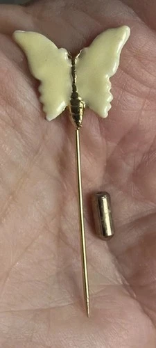 Vintage Ecru Ivory Enamel Butterfly Stick Pin Gold Tone Metal Hat Lapel Hair Pin