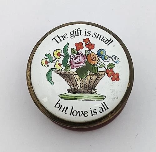 HALCYON DAYS "THE GIFT IS SMALL BUT LOVE IS ALL" ENAMEL PILL BOX