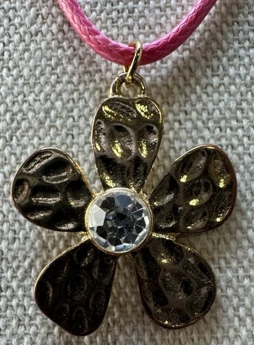 Beautiful Vintage Flower Power Goldtone Hammered Pendant On Cord Necklace