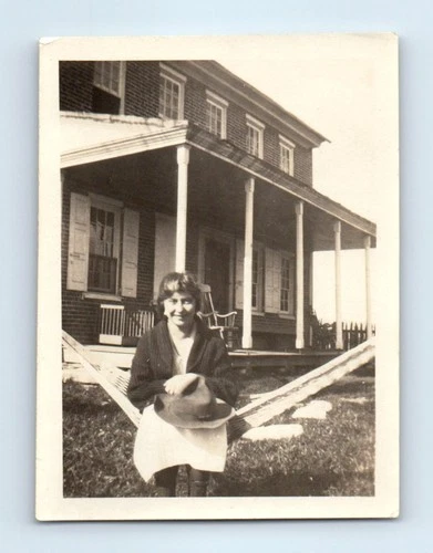 Old Vintage Photo SOLO WOMAN SITTING ON HAMMOCK OUTSIDE HOUSE HAT SNAPSHOT