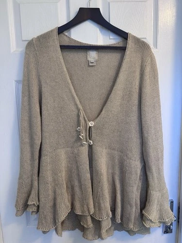 AMANO Bolivia hand Knit Cardigan M/L Linen Cotton Beige Ruffle Bell Sleeve