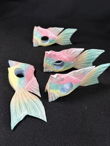 Hand-Carved Wooden Fish Napkin Rings Set Of 4 Pastel Painted Table Decor