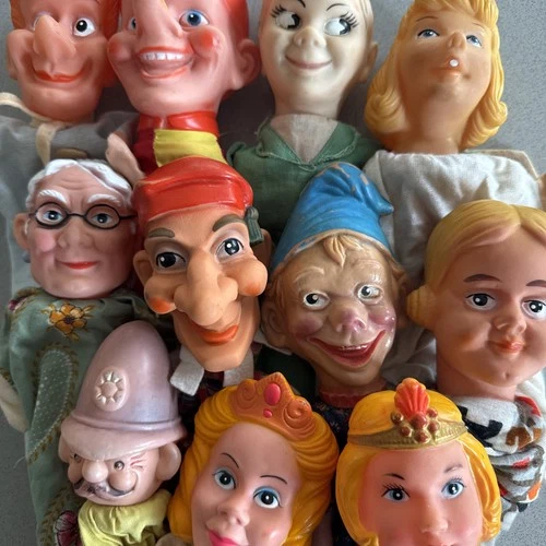 11 Rubber Headed Hand Puppets Glove Punch & Judy Style German 1960s 1970s Retro