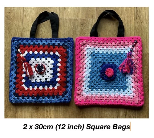 Two Handmade Crocheted 30cm (12”) Square Black Lined Tote Style Hand Bags