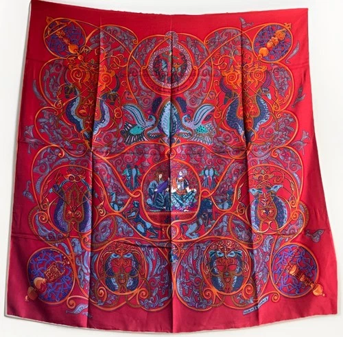 Hermes Scarf Paris La Charmante aux Animaux Red Violet Purple Orange Blue Genie