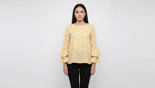 Custom Hand Stitched Blouse Womens L Yellow Floral Ruffle Cuffs Round Neck Top
