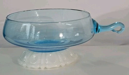 VTG ITALIAN ART GLASS BLUE CURLED APPLIED HANDLED HAND BLOWN GLASS PAN BOWL DISH