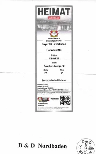 Ticket / Entry Ticket 17/18 1st Liga Bayer 04 Leverkusen v Hannover 96