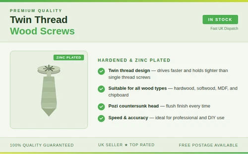 Recess Twin Thread Woodscrews | Zinc Plated | Hardened | Bulk | Fast UK Dispatch