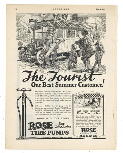 1927 Frank Rose Mfg. Co. of Hastings, Nebraska Ad: ROSE Tire Pumps & Awnings