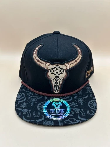 Top Level Cowboy Longhorn Black Snapback Hat With Brown Rope String - NWT