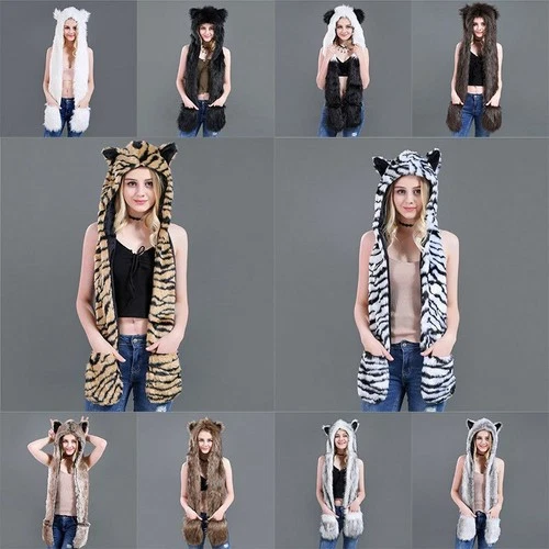 New Hat Gloves 3in1 Hood Women Gift Mittens Scarf Paws Faux Fur Animal Ears Fash