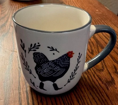Coffee Mug Hen Rooster Chicken Farm Country Ceramic New 12 Ounces White Navy