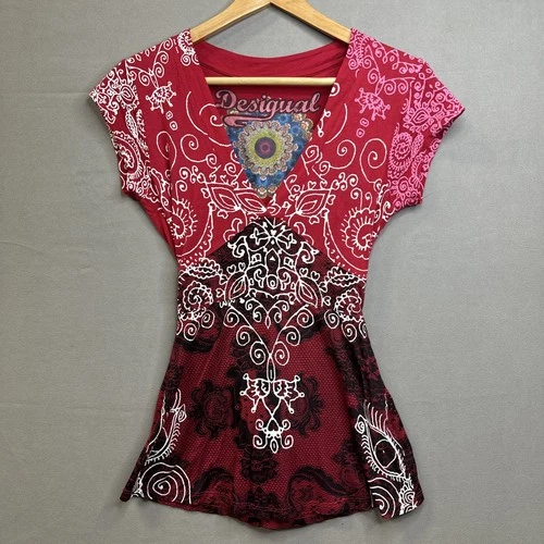 Desigual Top Tunic Womens XS Red White Floral Print Babydoll Tie Belt Boho Henna