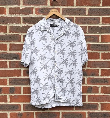 All Saints Mens SANTACRUZ Hawaiian Shirt MEDIUM Grey Palm Beach Short Sleeve