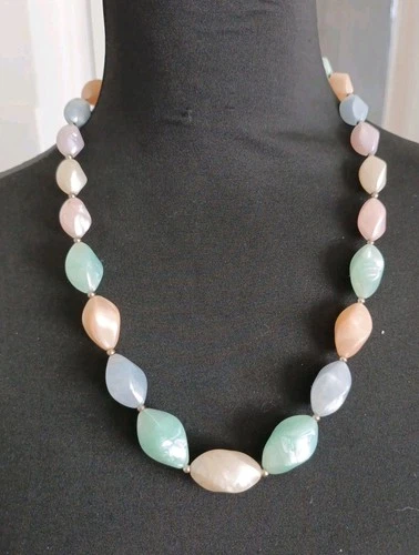 Pastel Tone Beaded Necklace Blue Pink Peach Green Cream Silver Tone Spacers 22"