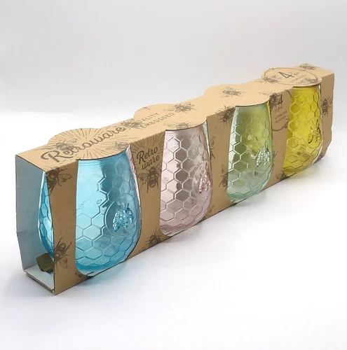 RETROWARE BY HOME ESSENTIALS EMBOSSED HONEYCOMB BEE STEMLESS GLASSES ASSORTED CO