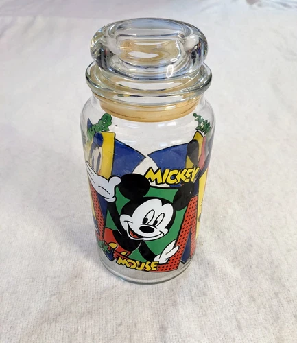 Vtg Disney Anchor Hocking 8” Donald Minnie, Mickey Mouse Kitchen Glass Jar w Lid