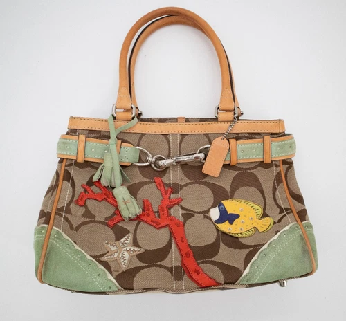 COACH #H05Q-1489 Bubble Fish Red Coral Leather Embroidered Suede Trim Hand Bag