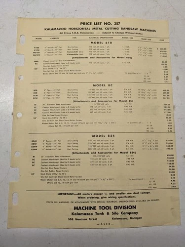 KALAMAZOO BAND SAW TOOL PARTS PRICE LIST #357 HORIZONTAL METAL CUTTING MACHINE