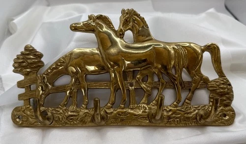 Vintage Brass Horses Equestrian Wall Key Jewelry Holder 4 Hooks 9” x 5”