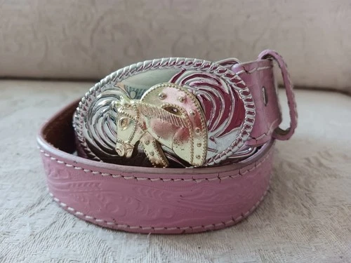 Nocona Belt Girls Pink Tooled Leather Western Belt Sz 24 Brass Silver Horse Buck