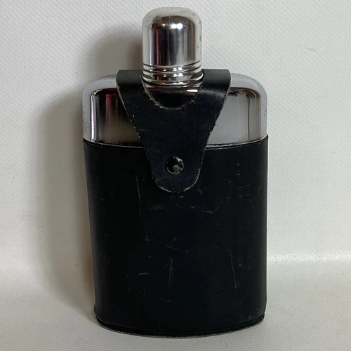 Vintage Harness House Glove Steer Black Leather Wrapped Flask Stainless Glass