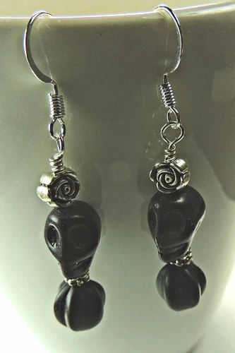 Black Howlite Skull Dangle Earrings Silver Color Roses Handmade Boho Chic