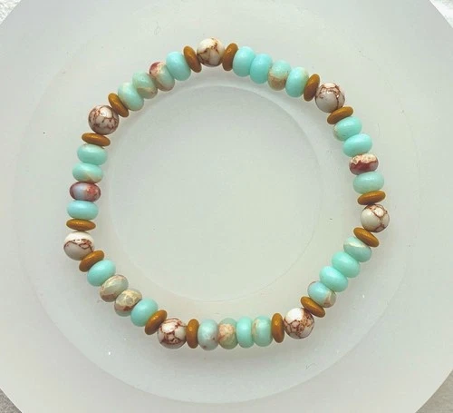 Bracelet Stretchy Gold-veined Howlite & Czech Glass Spacers Size 6.7”
