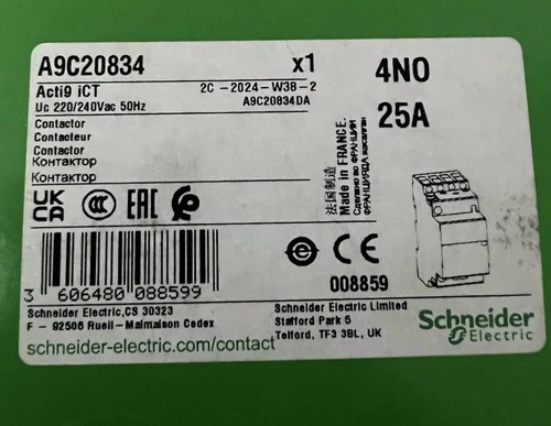 Schneider Acti 9 iCT A9C20834 25 Amp 4NO 4 Pole 240V 50Hz Contactor