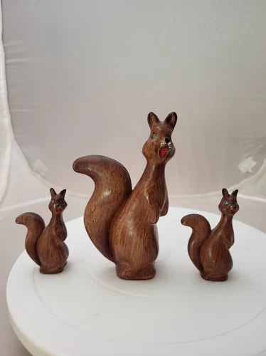 3 Vintage Faux Wood Squirrel Figurines Rhinestone Green Eyes Hongkong- B8