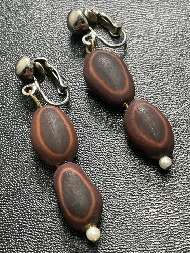 Vintage Wood Nut Faux Pearl Retro Dangle Clip Earrings