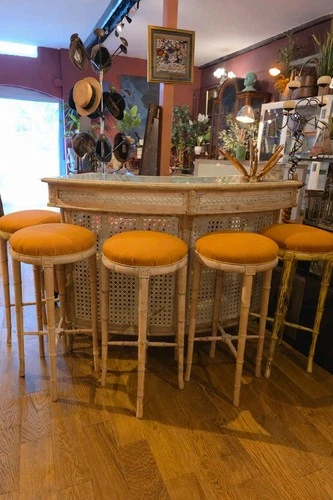 Vintage Faux Bamboo Cane Bar & 4 Stools Hollywood Regency Tiki Palm Beach Style
